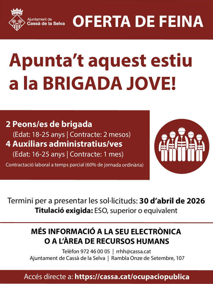 L’Ajuntament de Cassà de la Selva posa en marxa, un any més, la Brigada Jove. Aquest programa d’acció formativa i ocupació juvenil impulsat des de l’àrea de Joventut està adreçat especialment a joves que volen iniciar-se en el món laboral i adquirir experiència professional en un entorn proper i formatiu. L’objectiu és facilitar la primera experiència laboral a les persones joves del municipi.