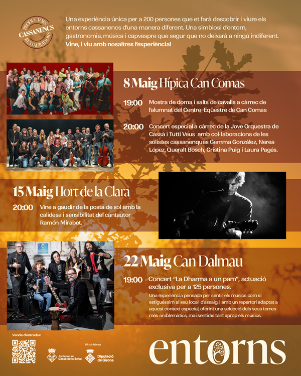 La primera experiència tindrà lloc el divendres 8 de maig al Centre Eqüestre Can Comas amb el “Gran concert de capvespre cassanenc” amb la participació de més de 40 músics, a càrrec de la Jove Orquestra de Cassà i Tutti Veus i la col·laboració de les artistes cassanenques Gemma González, Nerea López, Queralt Bosch, Cristina Puig i Laura Pagès. La proposta fusiona talent local i música en directe en un entorn únic.