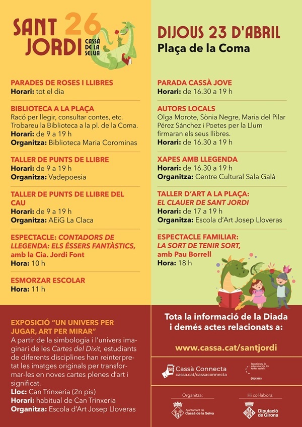 Un any més, la plaça de la Coma de Cassà es convertirà en el punt de referència de la Diada de Sant Jordi al municipi. L’espai acollirà durant tot el dia, parades de llibres, tallers, espectacles familiars i la tradicional signatura de llibres per part d'autores locals.