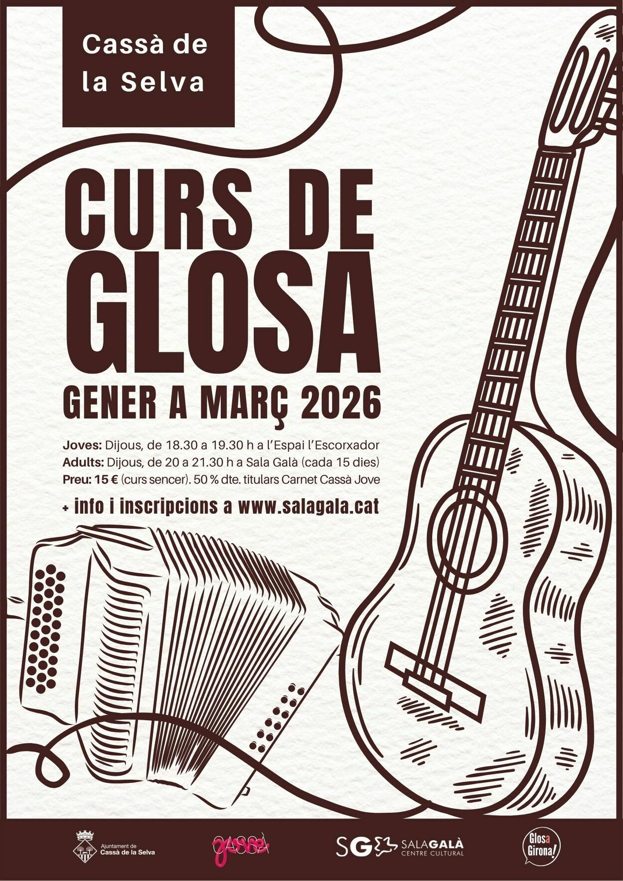 L’Ajuntament de Cassà de la Selva posarà en marxa el proper mes de gener, la primera edició d’un Curs de Glosa. Aquesta iniciativa està pensada per iniciar-se en l’art de la cançó improvisada, una forma tradicional i creativa d’expressar-se a través de la música i la paraula. Al mateix temps, aquest curs neix amb la voluntat de consolidar la glosa com una activitat cultural de referència al municipi.